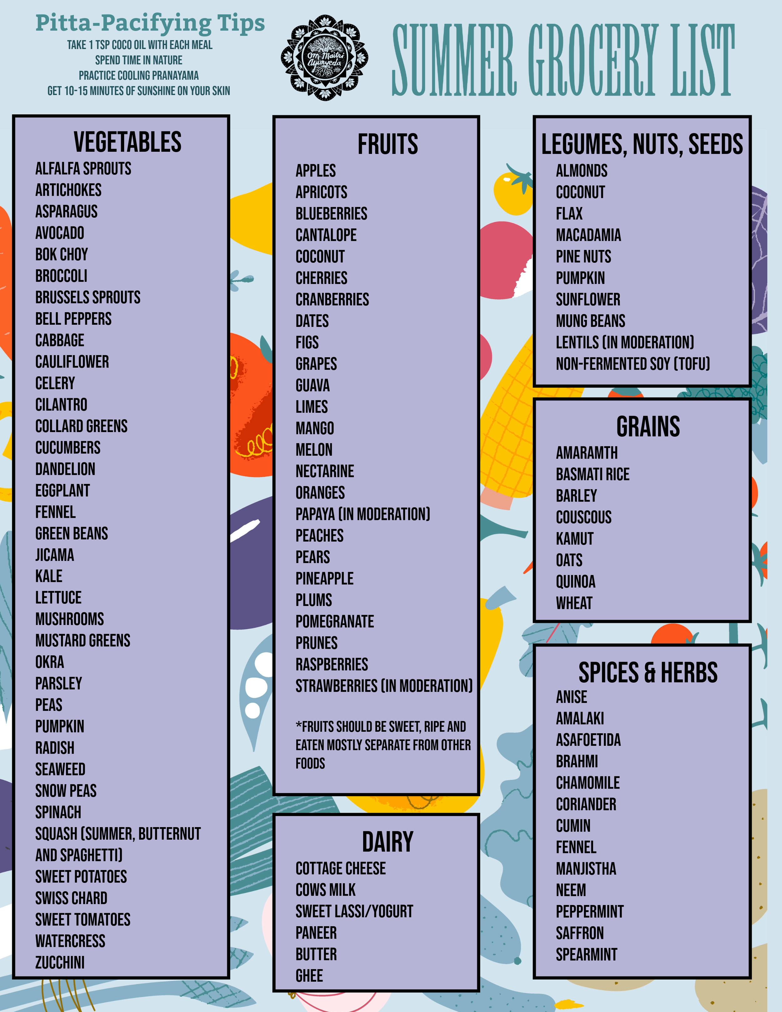 Summer delivers extra pitta dosha and the qualities of pitta are hot, oily, unstable and sharp! The foods and tips below create balance with their stable and soft qualities that hydrate and cool from the inside.